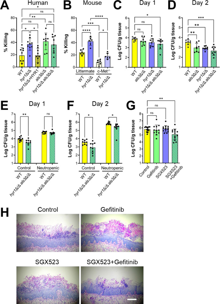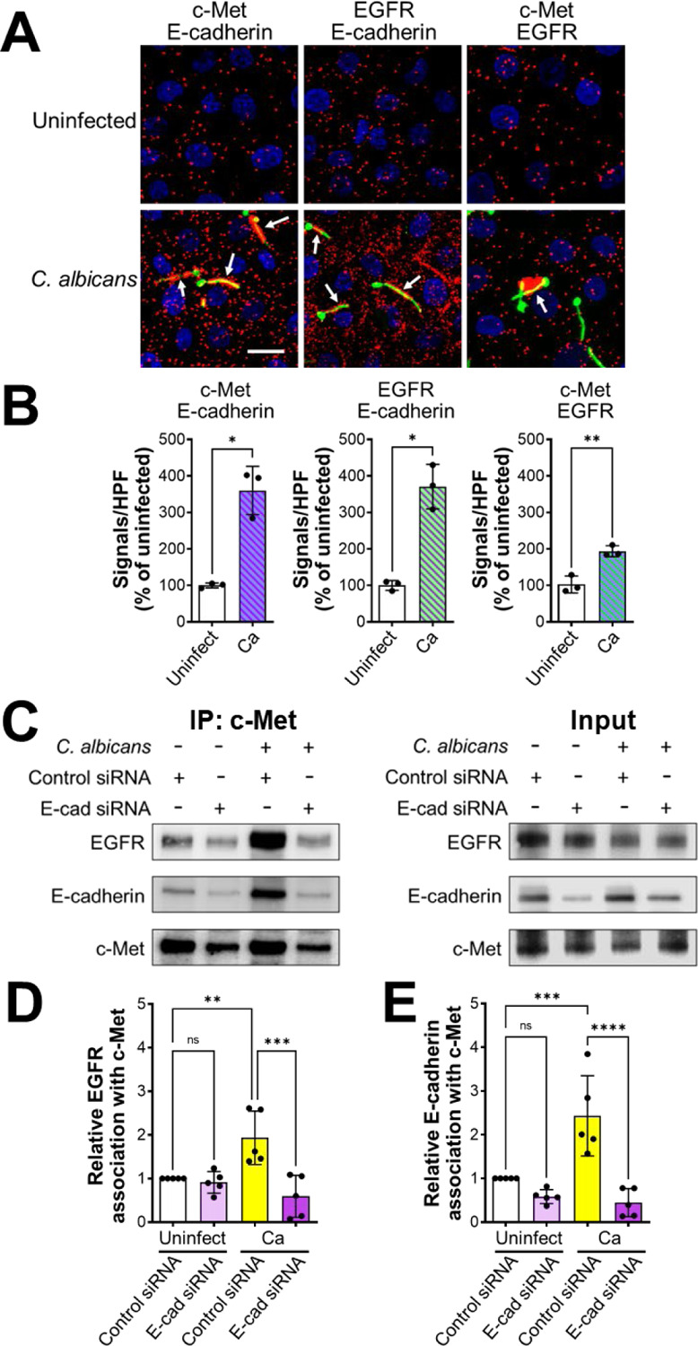Highlights: c-Met is an oral epithelial cell receptor for Candida albicans C. albicans infection causes c-Met and the epidermal growth factor receptor (EGFR) to form a complex with E-cadherin, which is required for c-Met and EGFR function C. albicans Hyr1 and Als3 interact with c-Met and EGFR, inducing oral epithelial cell endocytosis and virulence during oropharyngeal candidiasis Dual blockade of c-Met and EGFR ameliorates oropharyngeal candidiasis.