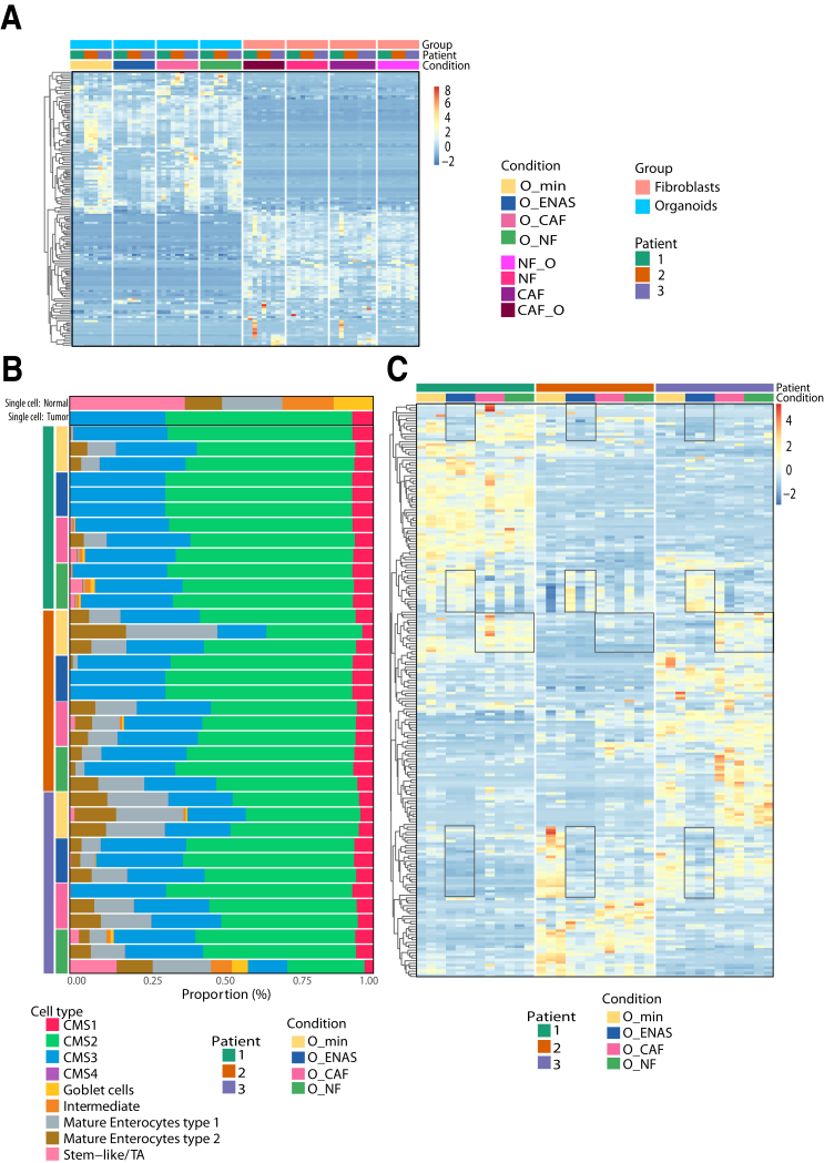 Methods: Primary fibroblasts and tumor cells were isolated from colorectal cancer specimens. Fibroblasts were characterized for their proteome, secretome, and gene expression signatures. Fibroblast/organoid co-cultures were analyzed by immunohistochemistry and compared with their tissue of origin, as well as on gene expression levels compared with standard organoid models. Bioinformatics deconvolution was used to calculate cellular proportions of cell subsets in organoids based on single-cell RNA sequencing data.