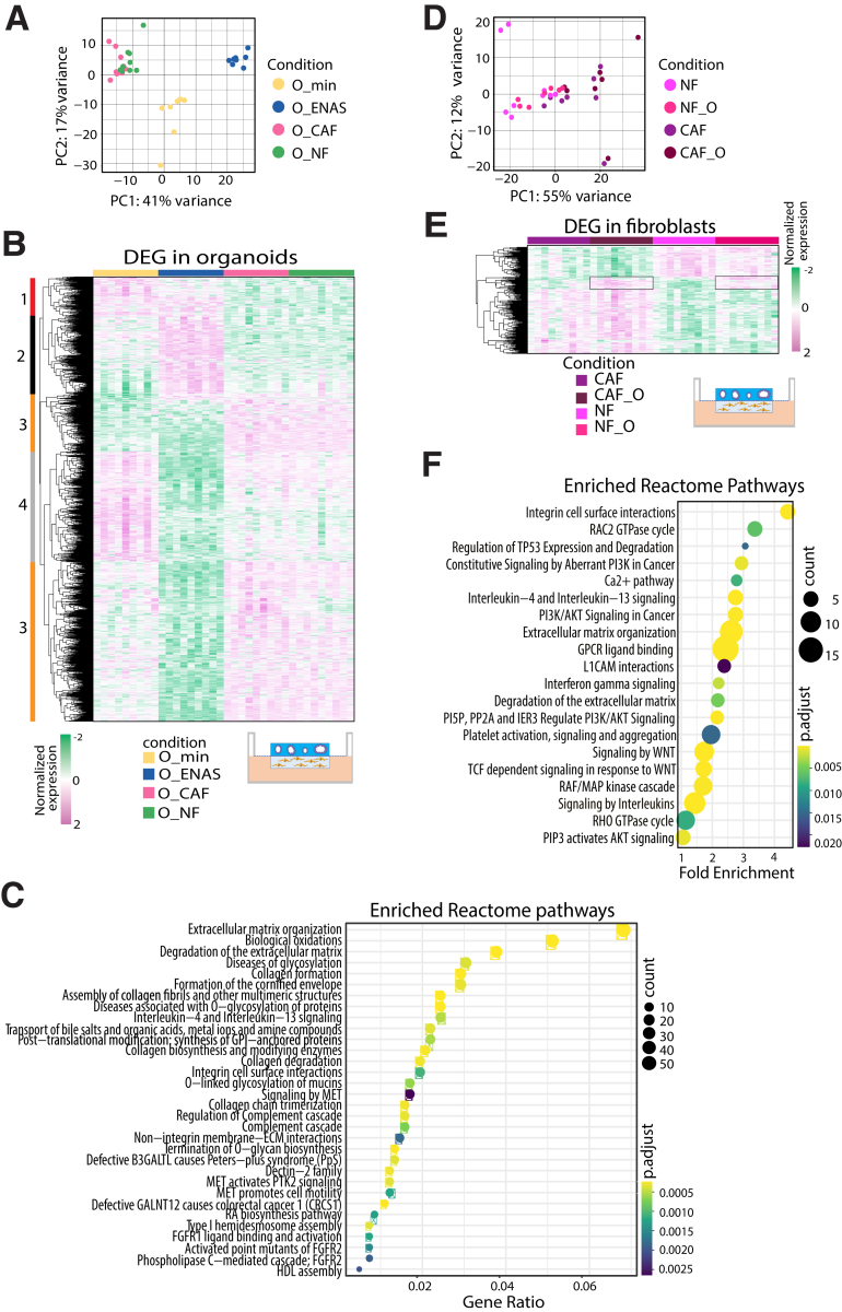 Results: Normal primary fibroblasts, isolated from tumor adjacent tissue, and cancer associated fibroblasts retained their molecular characteristics in vitro, including higher motility of cancer associated compared with normal fibroblasts. Importantly, both cancer-associated fibroblasts and normal fibroblasts supported cancer cell proliferation in 3D co-cultures, without the addition of classical niche factors. Organoids grown together with fibroblasts displayed a larger cellular heterogeneity of tumor cells compared with mono-cultures and closely resembled the in vivo tumor morphology. Additionally, we observed a mutual crosstalk between tumor cells and fibroblasts in the co-cultures. This was manifested by considerably deregulated pathways such as cell-cell communication and extracellular matrix remodeling in the organoids. Thrombospondin-1 was identified as a critical factor for fibroblast invasiveness.