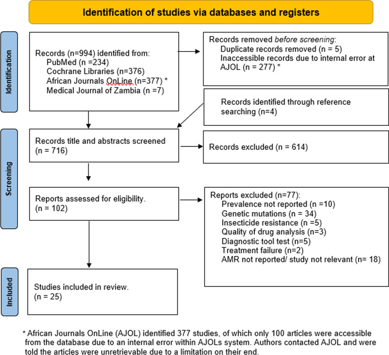 Methods: PubMed, Cochrane Libraries, Medical Journal of Zambia and African Journals Online databases were searched from inception to April 2021 for articles published in English in accordance with the PRISMA guidelines. Retrieval and screening of article was done using a structured search protocol with strict inclusion/exclusion criteria.