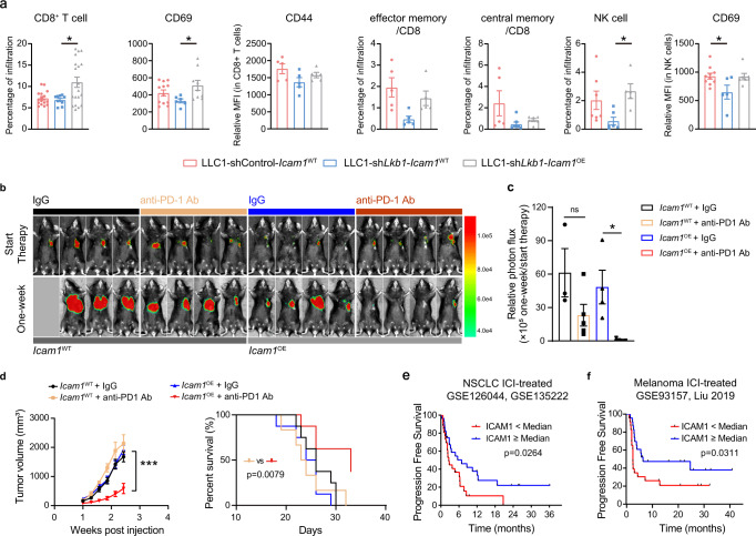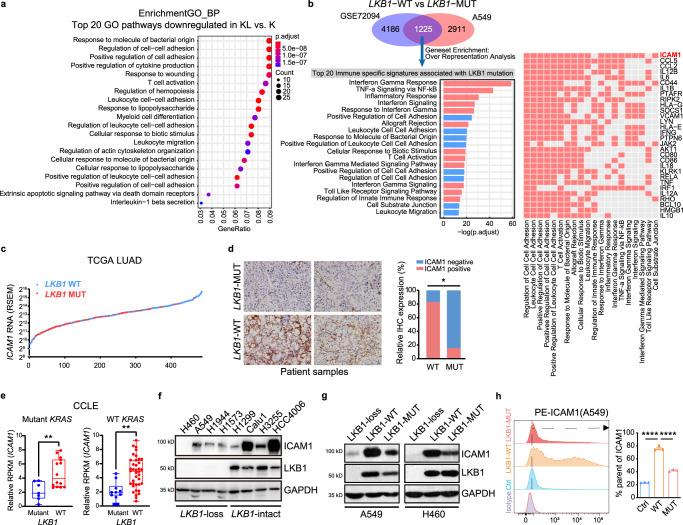Liver kinase B1 (LKB1) mutation is prevalent and a driver of resistance to immune checkpoint blockade (ICB) therapy for lung adenocarcinoma. Here leveraging single cell RNA sequencing data, we demonstrate that trafficking and adhesion process of activated T cells are defected in genetically engineered Kras-driven mouse model with Lkb1 conditional knockout. LKB1 mutant cancer cells result in marked suppression of intercellular adhesion molecule-1 (ICAM1). Ectopic expression of Icam1 in Lkb1-deficient tumor increases homing and activation of adoptively transferred SIINFEKL-specific CD8+ T cells, reactivates tumor-effector cell interactions and re-sensitises tumors to ICB. Further discovery proves that CDK4/6 inhibitors upregulate ICAM1 transcription by inhibiting phosphorylation of retinoblastoma protein RB in LKB1 deficient cancer cells. Finally, a tailored combination strategy using CDK4/6 inhibitors and anti-PD-1 antibodies promotes ICAM1-triggered immune response in multiple Lkb1-deficient murine models. Our findings renovate that ICAM1 on tumor cells orchestrates anti-tumor immune response, especially for adaptive immunity.