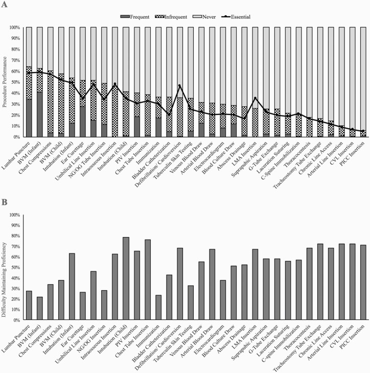 Results: The survey response rate was 33.2% (938/2,822). Data from participants who primarily practice general paediatrics were analyzed (n=481). Of these, 71.0% reported performing procedures. The most frequently performed procedures were: bag-valve-mask ventilation of an infant, lumbar puncture, and ear curettage, being performed monthly by 40.8%, 34.1%, and 27.7% of paediatricians, respectively. The procedures performed by most paediatricians were also those found most essential to practice, with a few exceptions. Respondents performed infant airway procedures with greater frequency and rated them more essential when compared to the same skill performed on children. We found a negative correlation between procedures being performed and difficulty maintaining proficiency in a skill.