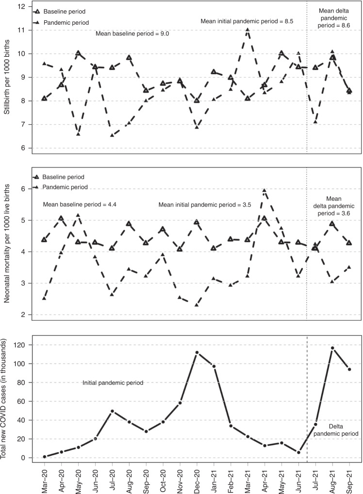 Results: A total of 325,036 deliveries were included (236,481 from baseline, 74,076 from initial pandemic, and 14,479 from delta pandemic period). The neonatal mortality rate was lower in the pandemic periods (4.4 to 3.5 and 3.6/1000 live births, in the baseline, initial, and delta pandemic periods, respectively, p < 0.01), but the stillbirth rate did not differ (9 to 8.5 and 8.6/1000 births, p = 0.41). On interrupted time-series analyses, there were no significant changes in either stillbirth (p = 0.11 for baseline vs. initial pandemic period, and p = 0.67 for baseline vs. delta pandemic period) or neonatal mortality rates (p = 0.28 and 0.89, respectively).