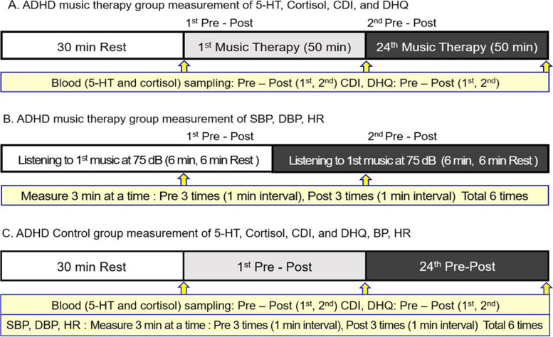 Methods: This study is designed based on randomization method. A total of 36 subjects participated in the experiment, consisting of an ADHD control group (n = 18) and ADHD music therapy group (n = 18). The ADHD control group received standard care, while the ADHD music therapy group received music therapy and standard care. The ADHD music therapy group received both active music therapy (improvisation) and receptive music therapy (music listening) for 50 minutes, twice a week, for 3 months: a total of 24 times. From a neurophysiological perspective, changes in depression and stress were tracked by measuring 5-HT secretion, cortisol expression, blood pressure (BP), heart rate (HR), and CDI and DHQ psychological scales.