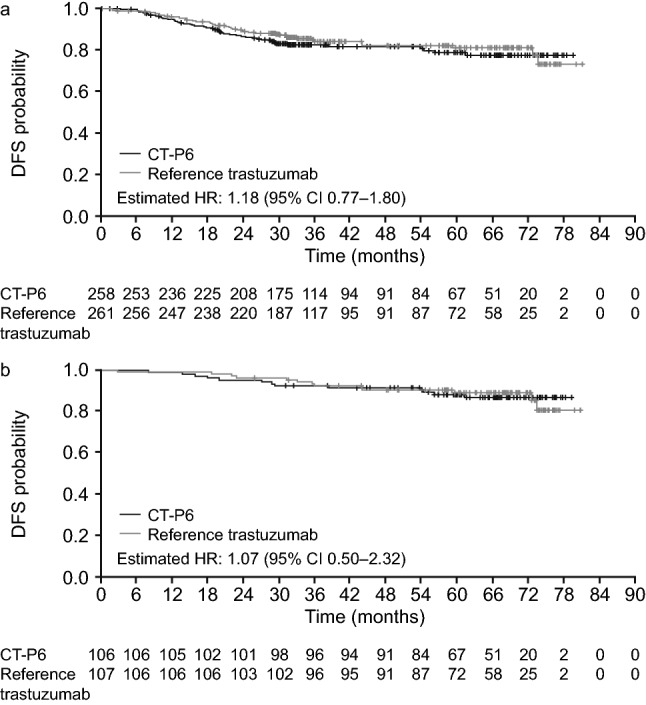 Results: Of 549 patients enrolled in the CT-P6 3.2 study, 216 (39.3%) patients continued in the CT-P6 4.2 study (CT-P6, 107; reference trastuzumab, 109) (intention-to-treat extension set). Median follow-up was 76.4 months for both groups. Medians were not reached for time-to-event parameters; estimated hazard ratios (95% confidence intervals) for CT-P6 versus reference trastuzumab were 0.59 (0.17-2.02) for OS, 1.07 (0.50-2.32) for DFS, and 1.08 (0.50-2.34) for PFS. Corresponding 6-year survival rates in the CT-P6 and reference trastuzumab groups, respectively, were 0.96 (0.90-0.99) and 0.94 (0.87-0.97), 0.87 (0.78-0.92) and 0.89 (0.81-0.94), and 0.87 (0.78-0.92) and 0.89 (0.82-0.94).