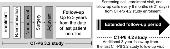 Methods: In the CT-P6 3.2 study, patients with HER2-positive early breast cancer were randomised to neoadjuvant chemotherapy with CT-P6 or reference trastuzumab, surgery, and adjuvant CT-P6 or reference trastuzumab before a 3-year post-treatment follow-up. Patients who completed the study could enter a 3-year extension (CT-P6 4.2 study). Data were collected every 6 months to assess overall survival (OS), disease-free survival (DFS), and progression-free survival (PFS).