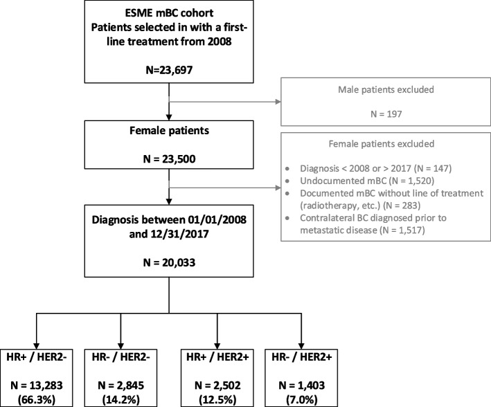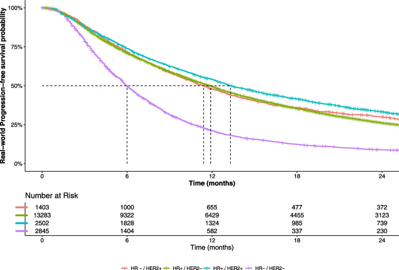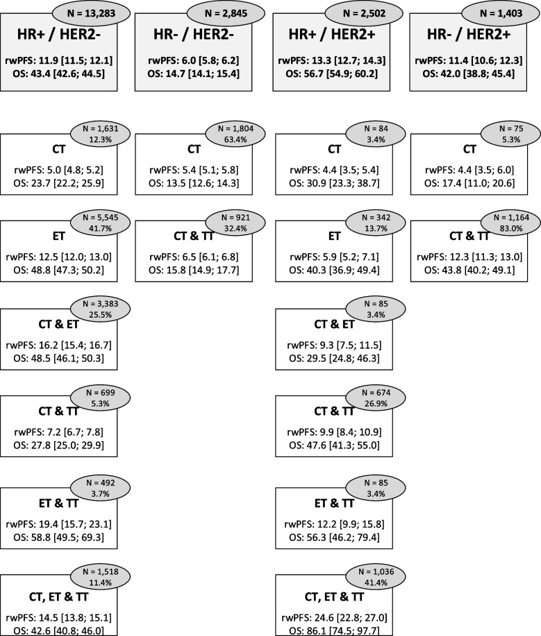 Results: 20,033 women were eligible. Median age was 60.0 years. Median follow-up duration was 62.3 months. Median rwPFS ranged from 6.0 months (95% CI 5.8-6.2) for HR-/HER2 - subtype to 13.3 months (36% CI 12.7-14.3) for HR + /HER2 + subtype. Correlation coefficients were highly variable across subtypes and first-line (L1) treatments. Among patients with HR - /HER2 - mBC, correlation coefficients ranged from 0.73 to 0.81, suggesting a strong rwPFS/OS association. For HR + /HER2 + mBC patients, the individual-level associations were weak to strong with coefficients ranging from 0.33 to 0.43 for monotherapy and from 0.67 to 0.78 for combined therapies.