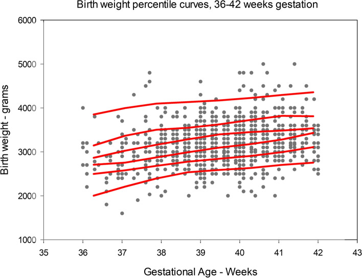 Results: A total of 1291 infants (of 1408 pregnant women randomized) were included. Ninety-three infants did not have a measured birth weight. The majority of these were due to miscarriage (n = 49) or stillbirth (n = 27). No significant differences were found between subjects who were lost to follow-up. Signed rank comparisons of the observed median of the Western Kenya data at 10th, 50th, and 90th birthweight percentiles, as compared to medians reported in the INTERGROWTH-21st distributions, revealed close alignment between the two datasets, with significant differences at 36 and 37 weeks. Limitations of the current study include small sample size, and detection of potential digit preference bias.