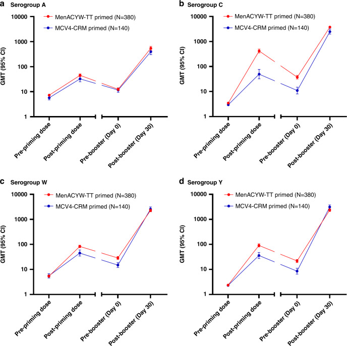 Methods: This phase IIIb open-label trial (NCT04084769) evaluated MenACYW-TT-primed participants, randomized to receive MenACYW-TT alone or with a MenB vaccine, and MCV4-CRM-primed participants who received MenACYW-TT alone. Functional antibodies against serogroups A, C, W and Y were measured using human complement serum bactericidal antibody assay (hSBA). The primary endpoint was vaccine seroresponse (post-vaccination titers ≥1:16 if pre-vaccination titers <1:8; or a ≥4-fold increase if pre-vaccination titers ≥1:8) 30 days post booster. Safety was evaluated throughout the study.