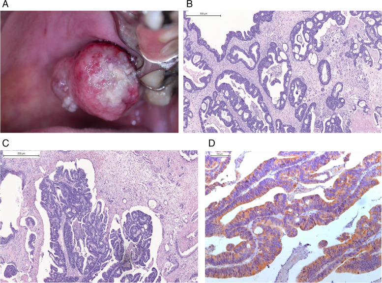 Conclusions: Colon adenocarcinoma with metastasis to the oral cavity is rare but should be included in the differential diagnosis of neoplasms of the oral cavity, even when there are no known primary tumors in some cases, and this may be the first indication of the presence of a tumor.