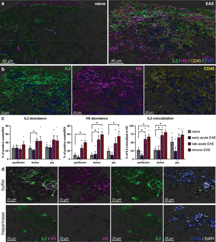 FOXP3+ regulatory T cells (Treg) depend on exogenous IL-2 for their survival and function, but circulating levels of IL-2 are low, making it unclear how Treg access this critical resource in vivo. Here, we show that Treg use heparanase (HPSE) to access IL-2 sequestered by heparan sulfate (HS) within the extracellular matrix (ECM) of inflamed central nervous system tissue. HPSE expression distinguishes human and murine Treg from conventional T cells and is regulated by the availability of IL-2. HPSE-/- Treg have impaired stability and function in vivo, including the experimental autoimmune encephalomyelitis (EAE) mouse model of multiple sclerosis. Conversely, endowing Treg with HPSE enhances their ability to access HS-sequestered IL-2 and their tolerogenic function in vivo. Together, these data identify novel roles for HPSE and the ECM in immune tolerance, providing new avenues for improving Treg-based therapy of autoimmunity.