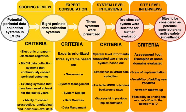 Methods: We conducted a rapid review of the literature to identify frameworks on population health or post-marketing drug surveillance. Four frameworks that met the eligibility criteria were identified and served to develop an assessment tool capable of evaluating sites that could support active monitoring of vaccine safety during pregnancy. We conducted semi-structured interviews in six geographical sites using MNCH data collection systems (DHIS2, INDEPTH, and GNMNHR) to pilot domains included in the assessment tool.