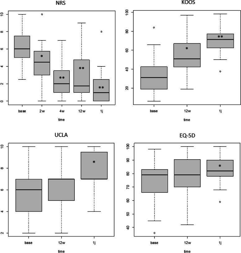 Methods: Thirty subjects (age 48y ± 13) were included in a double-center prospective case series. A low-dose CT-scan was performed to generate 3D bone models, a MOWHTO was simulated, and PSI was designed and 3D printed based on the complementary negative of the planned osteotomy gap. Clinical outcome was assessed at two, four, 12 weeks and one year using NRS, KOOS, UCLA activity score, EQ-5D and anchor questions. A linear-mixed model approach was implemented for data analysis.