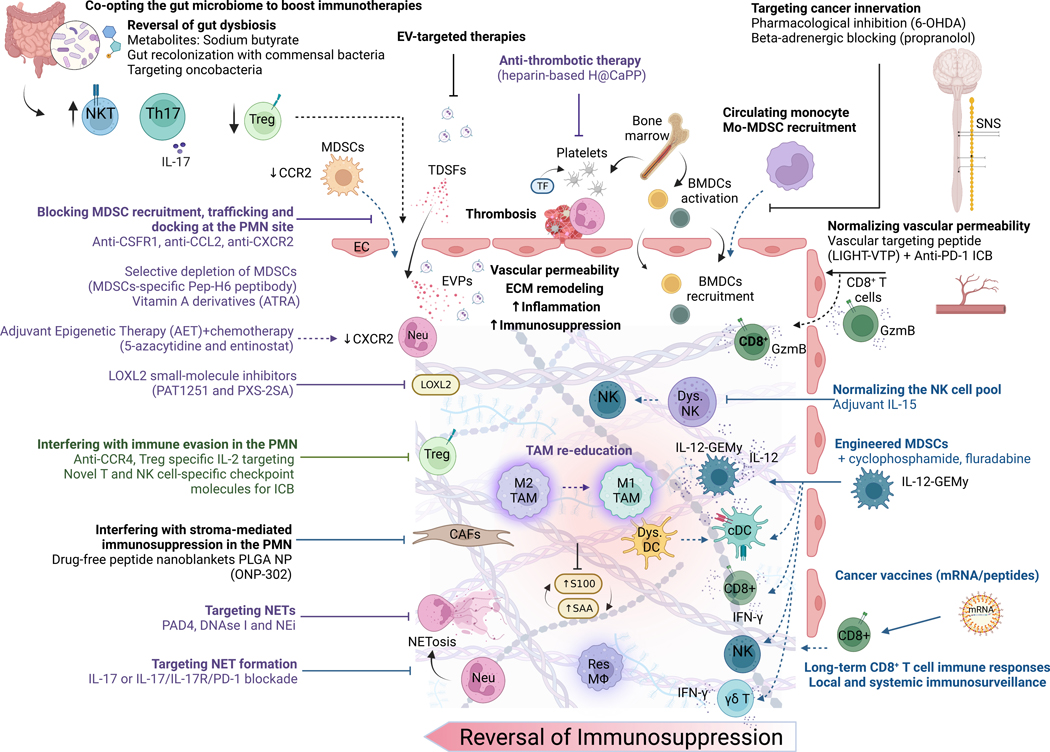 Primary tumors actively and specifically prime pre-metastatic niches (PMNs), the future sites of organotropic metastasis, preparing these distant microenvironments for disseminated tumor cell arrival. While initial studies of the PMN focused on extracellular matrix alterations and stromal reprogramming, it is increasingly clear that the far-reaching effects of tumors are in great part achieved through systemic and local PMN immunosuppression. Here, we discuss recent advances in our understanding of the tumor immune microenvironment and provide a comprehensive overview of the immune determinants of the PMN's spatiotemporal evolution. Moreover, we depict the PMN immune landscape, based on functional pre-clinical studies as well as mounting clinical evidence, and the dynamic, reciprocal crosstalk with systemic changes imposed by cancer progression. Finally, we outline emerging therapeutic approaches that alter the dynamics of the interactions driving PMN formation and reverse immunosuppression programs in the PMN ensuring early anti-tumor immune responses.