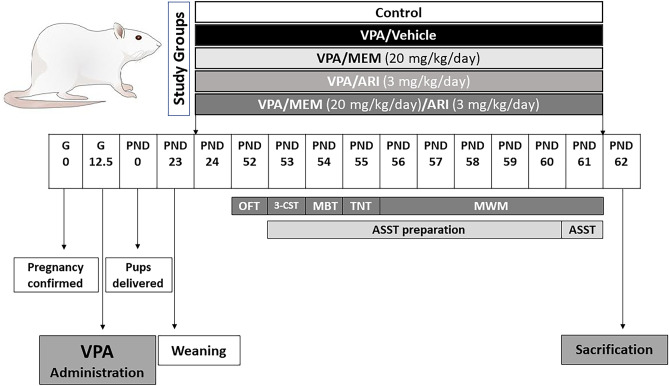 Significant efforts are increasingly directed towards identifying novel therapeutic targets for autism spectrum disorder (ASD) with a rising role of aberrant glutamatergic transmission in the pathogenesis of ASD-associated cellular and behavioral deficits. This study aimed at investigating the role of chronic memantine (20 mg/kg/day) and aripiprazole (3 mg/kg/day) combination therapy in the management of prenatal sodium valproate (VPA)-induced autistic-like/cognitive deficits in male Wistar rats. Pregnant female rats received a single intraperitoneal injection of VPA (600 mg/kg) to induce autistic-like behaviors in their offspring. Prenatal VPA induced autistic-like symptoms (decreased social interaction and the appearance of stereotyped behavior) with deficits in spatial learning (in Morris water maze) and cognitive flexibility (in the attentional set-shifting task) in addition to decreased hippocampal protein levels of phosphorylated cAMP response element-binding protein (p-CREB), brain-derived neurotrophic factor (BDNF), and gene expression of glutamate transporter-1 (Glt-1) with a decline in GABA/glutamate ratio (both measured by HPLC). These were accompanied by the appearance of numerous neurofibrillary tangles (NFTs) with enhanced apoptosis in hippocampal sections. Memantine/aripiprazole combination increased the protein levels of p-CREB, BDNF, and Glt-1 gene expression with restoration of GABA/glutamate balance, attenuation of VPA-induced neurodegenerative changes and autistic-like symptoms, and improvement of cognitive performance. This study draws attention to the favorable cognitive effects of memantine/aripiprazole combination in autistic subjects which could be mediated via enhancing CREB/BDNF signaling with increased expression of astrocytic Glt-1 and restoration of GABA/glutamate balance, leading to inhibition of hippocampal NFTs formation and neuronal apoptosis.