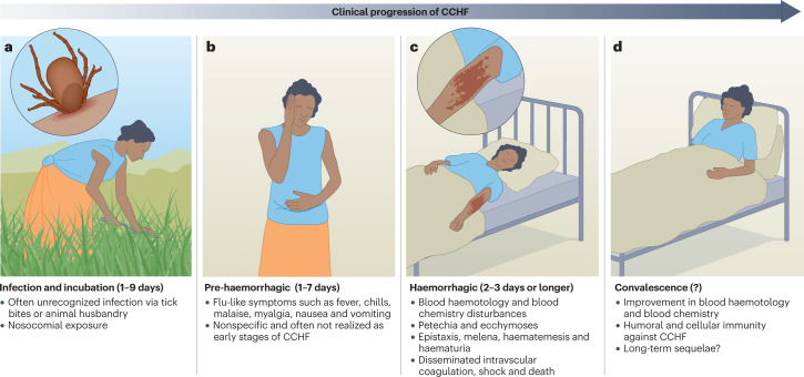 Crimean-Congo haemorrhagic fever (CCHF) is a severe tick-borne illness with a wide geographical distribution and case fatality rates of 30% or higher. Caused by infection with the CCHF virus (CCHFV), cases are reported throughout Africa, the Middle East, Asia and southern and eastern Europe. The expanding range of the Hyalomma tick vector is placing new populations at risk for CCHF, and no licensed vaccines or specific antivirals exist to treat CCHF. Furthermore, despite cases of CCHF being reported annually, the host and viral determinants of CCHFV pathogenesis are poorly understood. CCHFV can productively infect a multitude of animal species, yet only humans develop a severe illness. Within human populations, subclinical infections are underappreciated and may represent a substantial proportion of clinical outcomes. Compared with other members of the Bunyavirales order, CCHFV has a more complex genomic organization, with many viral proteins having unclear functions in viral pathogenesis. In recent years, improved animal models have led to increased insights into CCHFV pathogenesis, and several antivirals and vaccines for CCHFV have shown robust efficacy in preclinical models. Translation of these insights and candidate therapeutics to the clinic will hopefully reduce the morbidity and mortality caused by CCHFV.