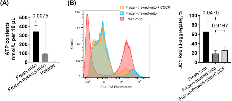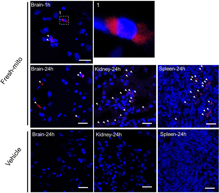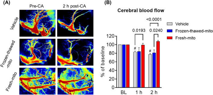 Results: The donated mitochondria were successfully taken up into cultured neural cells. Transferred exogenous mitochondria co-localized with endogenous mitochondria inside neural cells. ATP content in fresh mitochondria was approximately four times higher than in frozen-thawed mitochondria. In the in vivo survival study, freshly isolated functional mitochondria, but not frozen-thawed mitochondria, significantly increased 72-h survival from 55 to 91% (P = 0.048 vs. vehicle). The beneficial effects on survival were associated with improvements in rapid recovery of arterial lactate and glucose levels, cerebral microcirculation, lung edema, and neurological function. Labeled mitochondria were observed inside the vital organs of the surviving rats 24 h post-CA.