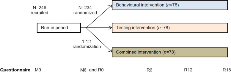Illustration of the study design of the ICECREAM study. Abbreviations: M0, month 0; M6, month 6; R0, randomisation months 0; R6, randomisation month 6; R12, randomisation month 12; R18, randomisation month 18