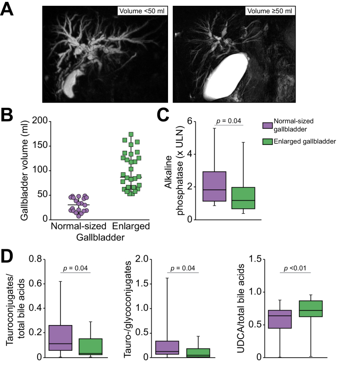 Results: Sixty-one patients with PSC, all treated with ursodeoxycholic acid (UDCA), were included. The gallbladder was enlarged in 30 patients, whereas 11 patients had been previously cholecystectomized. Patients with enlarged gallbladders had significantly lower alkaline phosphatase, a lower tauro-vs. glycoconjugate ratio and a higher UDCA vs. total bile acid ratio compared to those with normal-sized gallbladders. In addition, gallbladder volume negatively correlated with the hydrophobicity index of bile acids. Cholecystectomized patients displayed significantly higher aspartate aminotransferase and more severe bile duct strictures and dilatations compared to those with conserved gallbladder. In the Abcb4 knockout mice, cholecystectomy caused an increase in hepatic bile acid content and in circulating secondary bile acids, and an aggravation in cholangitis, inflammation and liver fibrosis.