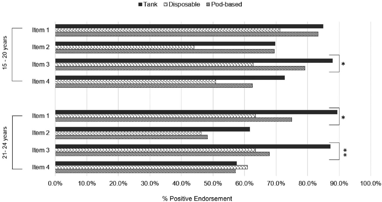 Background: E-cigarette device types vary in the amount of nicotine delivered to users. Given that youth and young adults are using pod-based and disposable e-cigarettes with high nicotine concentrations, it is important to determine how e-cigarette use behaviors associated with nicotine dependence may differ across e-cigarette device type. Methods: Baseline information was collected from September 2020 to March 2021 and follow-up information was collected from July to October 2021 from the Truth Longitudinal Cohort. The final analytic sample included respondents (aged 15-24) who reported current use of e-cigarettes at either baseline or follow-up and provided information on the 4-item E-cigarette Dependence Scale (EDS). Differences in endorsement of items from the EDS by e-cigarette device type (pod-based, disposable, or tank) were assessed using chi-square tests. Results: Participants (N = 308) were evenly split on age (15-20, 21+) and gender. Most 15-20-year-olds used disposable e-cigarettes, while those 21+ years primarily used tank devices. Although EDS score did not differ by e-cigarette device type, positive endorsement of two items from the EDS significantly differed by e-cigarette device type. More tank users endorsed reaching for a device without thinking about it (tank: 92.6%; pod-based: 79.0%; disposables: 79.9%, p = 0.04) and vaping more before going into a situation where vaping is not allowed (tank: 92.9%; pod-based: 71.0%; disposables: 73.0%, p < 0.01). Conclusions: Findings have the potential to inform policy implementation by providing evidence for specific targets for regulatory action that can help to reduce the burdens of e-cigarette use among youth and young adults, as results suggest that tank device users are more likely to endorse use behaviors associated with nicotine dependence.