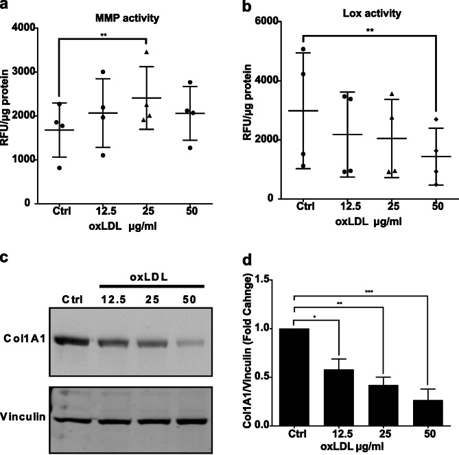 Methods: Isolated human tendon cells (male and female donors age 28 ± 1.4 age 37 ± 5.7, respectively) were incubated in the presence or absence of oxLDL. The influence of oxLDL on the expression level of key mRNA and proteins was examined using real time quantitative PCR, ELISA and Western blots. The activities of enzymes relevant to collagen synthesis and breakdown (lysyl oxidase and matrix metalloproteinases) were quantified using fluorometry. Finally, the isolated human tendon cells in a 3D construct were exposed to combinations of oxLDL and TGF-β to examine their interacting effects on collagen matrix remodeling.