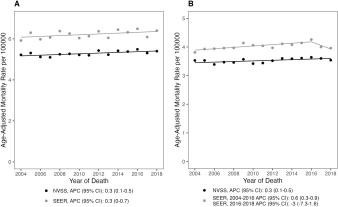 - Surveillance Epidemiology and End Results (SEER) Program (2022) SEER*Stat database: mortality—all COD, aggregated with state, total U.S. (2000–2018) <Katrina/Rita population adjustment>, National Cancer Institute, DCCPS, surveillance research program, surveillance systems branch, released May 2022. Underlying mortality data provided by NCHS (http:// www.cdc.gov/nchs).