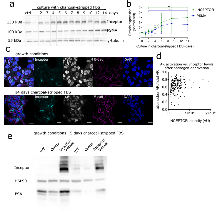 Results: We found that inceptor was expressed in human benign and malignant prostate tissue and its expression positively correlated with various genes of interest, including genes involved in androgen signaling. In vitro, total levels of inceptor were increased upon androgen deprivation and correlated with high levels of androgen receptor in the nucleus. Inceptor overexpression was associated with increased cell migration, altered IGF1R trafficking and higher IGF1R activation.