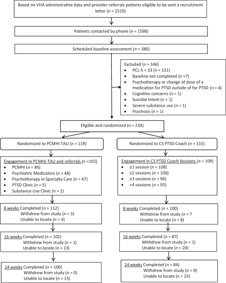 Objective: To test the effectiveness of a brief primary care-based treatment, Clinician-Supported PTSD Coach (CS PTSD Coach) was compared with Primary Care Mental Health Integration-Treatment as Usual (PCMHI-TAU) in (1) reducing PTSD severity, (2) engaging veterans in specialty mental health care, and (3) patient satisfaction with care.