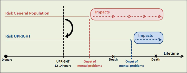 Background: As mental health in adulthood is related to mental status during adolescence, school-based interventions have been proposed to improve resilience. The objective of this study was to build a simulation model representing the natural history of mental disorders in childhood, adolescence and youth to estimate the cost-effectiveness of the UPRIGHT school-based intervention in promoting resilience and mental health in adolescence.