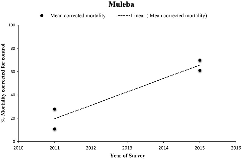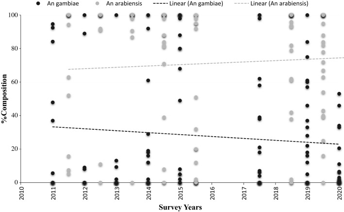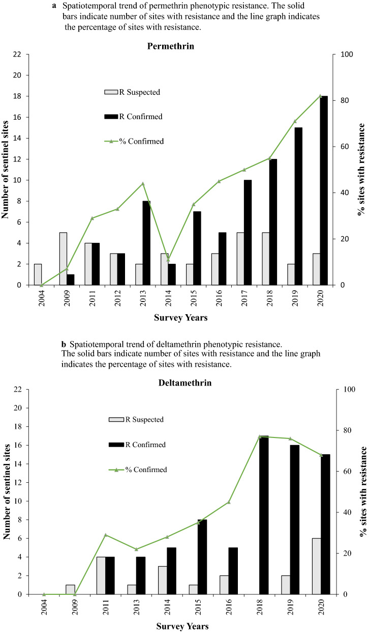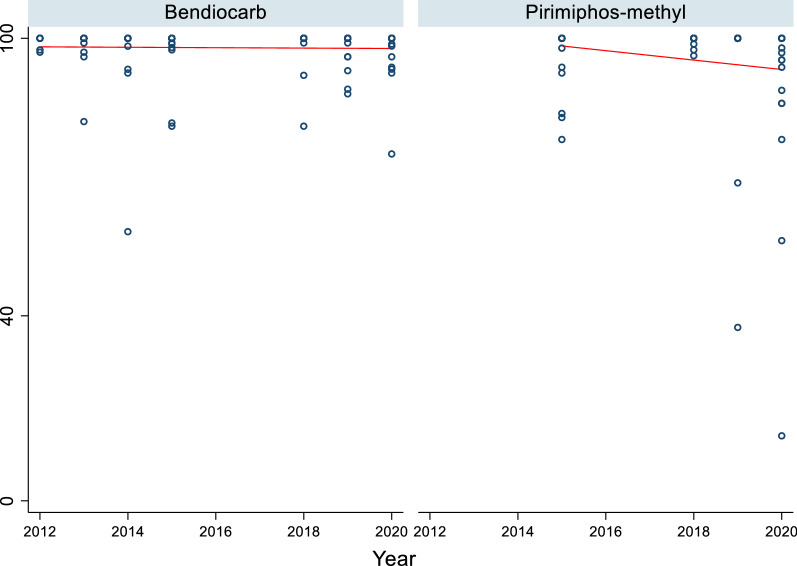 Results: Percentage of sites with pyrethroid resistance increased from 0% in 2004 to more than 80% in the 2020, suggesting resistance has been spreading geographically. Results indicate a strong negative association (p = 0.0001) between pyrethroids susceptibility status and survey year. The regression model shows that by 2020 over 40% of An. gambiae mosquitoes survived exposure to pyrethroids at their respective diagnostic doses. A decreasing trend of An. gambiae susceptibility to bendiocarb was observed over time, but this was not statistically significant (p = 0.8413). Anopheles gambiae exhibited high level of susceptibility to the pirimiphos-methyl in sampled sites.