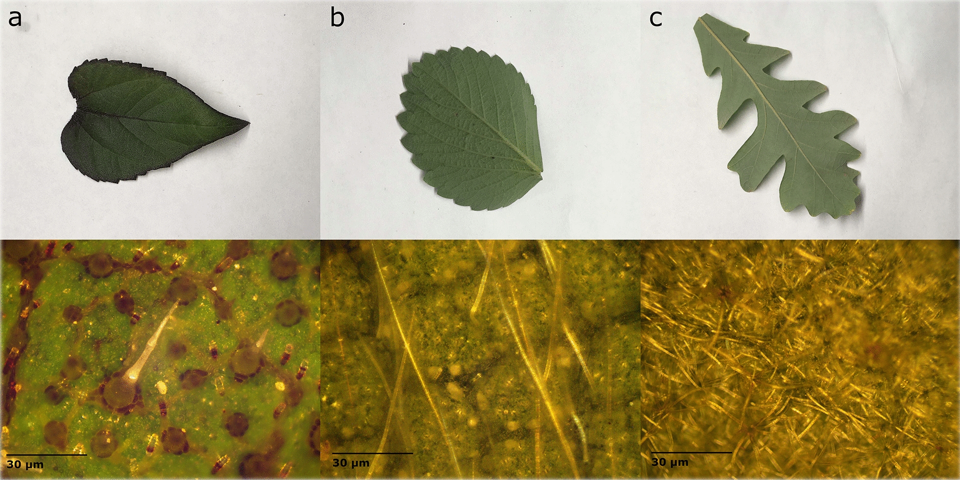 Background: Leaf surface phenotypes can indicate plant health and relate to a plant's adaptations to environmental stresses. Identifying these phenotypes using non-invasive techniques can assist in high-throughput phenotyping and can improve decision making in plant breeding. Identification of these surface phenotypes can also assist in stress identification. Incorporating surface phenotypes into leaf optical modelling can lead to improved biochemical parameter retrieval and species identification.