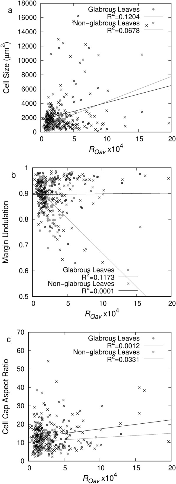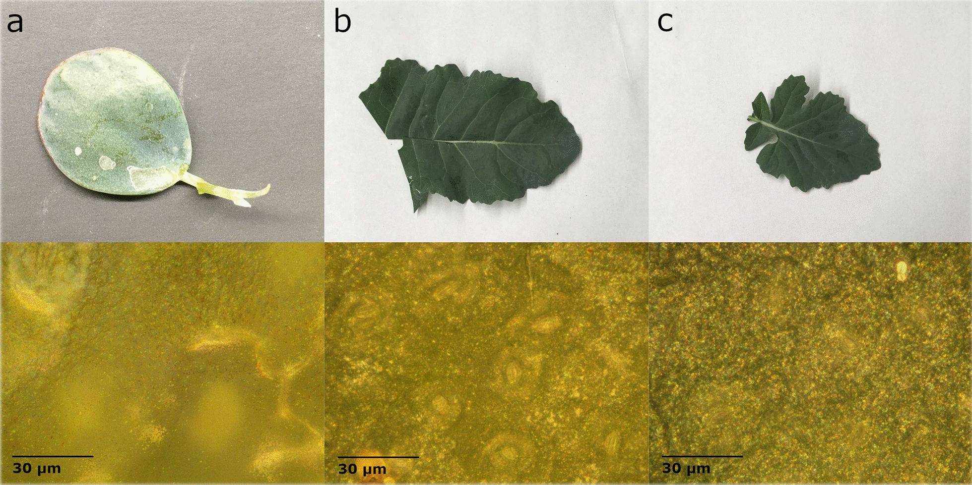 Results: In this paper, leaf surface phenotypes are characterized for 349 leaf samples based on polarized light reflectance measured at Brewster's Angle, and microscopic observation. Four main leaf surface phenotypes (glossy wax, glaucous wax, high trichome density, and glabrous) were identified for the leaf samples. The microscopic and visual observations of the phenotypes were used as ground truth for comparison with the spectral classification. In addition to surface classification, the microscope images were used to assess cell size, shape, and cell cap aspect ratios; these surface attributes were not found to correlate significantly with spectral measurements obtained in this study. Using a quadratic discriminant analysis function, a series of 10,000 classifications were run with the data randomly split between training and testing datasets, with 150 and 199 samples, respectively. The average correct classification rate was 72.9% with a worst-case classification of 60.3%.
