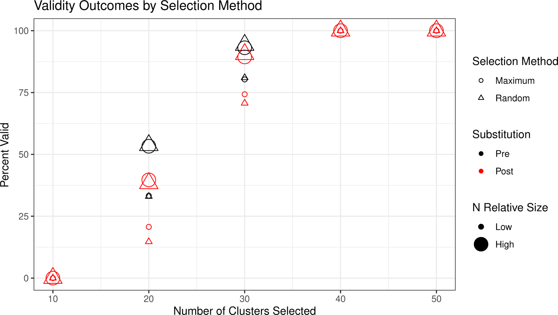 Methods: We developed an algorithm that successfully identified a subset of clusters that maximized the average minimum pairwise distance between clusters in order to reduce contamination and balanced the specified covariates both before and after substitutions were made.