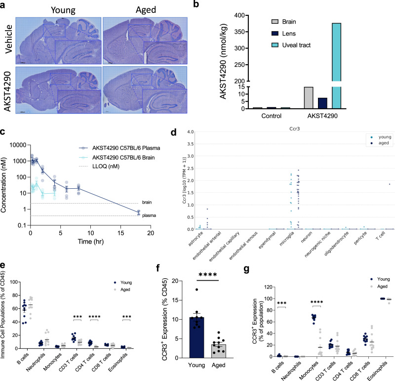 Targeting immune-mediated, age-related, biology has the potential to be a transformative therapeutic strategy. However, the redundant nature of the multiple cytokines that change with aging requires identification of a master downstream regulator to successfully exert therapeutic efficacy. Here, we discovered CCR3 as a prime candidate, and inhibition of CCR3 has pro-cognitive benefits in mice, but these benefits are not driven by an obvious direct action on central nervous system (CNS)-resident cells. Instead, CCR3-expressing T cells in the periphery that are modulated in aging inhibit infiltration of these T cells across the blood-brain barrier and reduce neuroinflammation. The axis of CCR3-expressing T cells influencing crosstalk from periphery to brain provides a therapeutically tractable link. These findings indicate the broad therapeutic potential of CCR3 inhibition in a spectrum of neuroinflammatory diseases of aging.