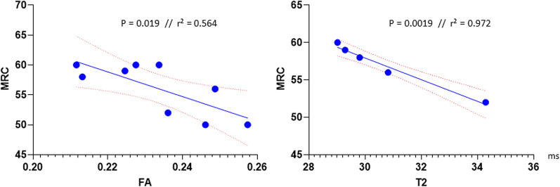 Results: qMRI parameters were significantly higher in the patients for fat-fraction (p < 0.001), water T2 time (p < 0.001), FA (p = 0.047), MD (p < 0.001) and RD (p < 0.001). Thighs and calves showed a different pattern with significantly higher water T2 times only in the calves. Correlation analysis showed a significant negative correlation of muscle strength (MRC sum score) with FA and T2-time. The results were related to impairment seen in QoL-questionnaires, clinical testing and electrophysiologic studies.