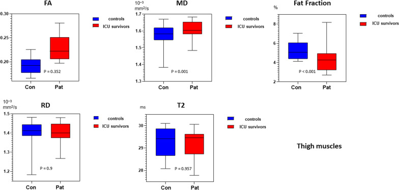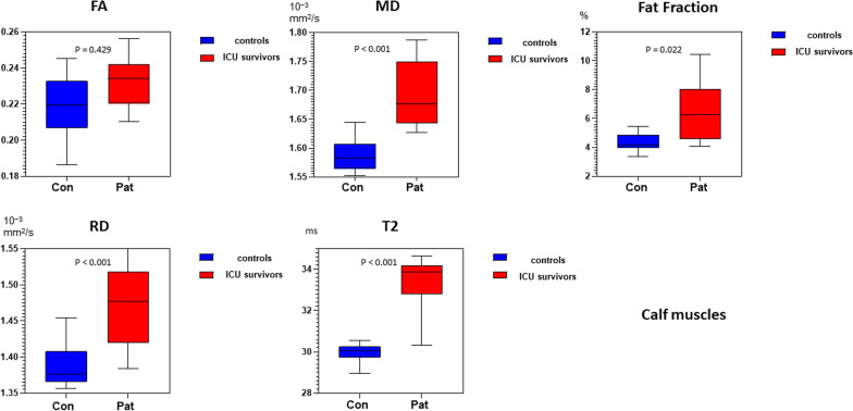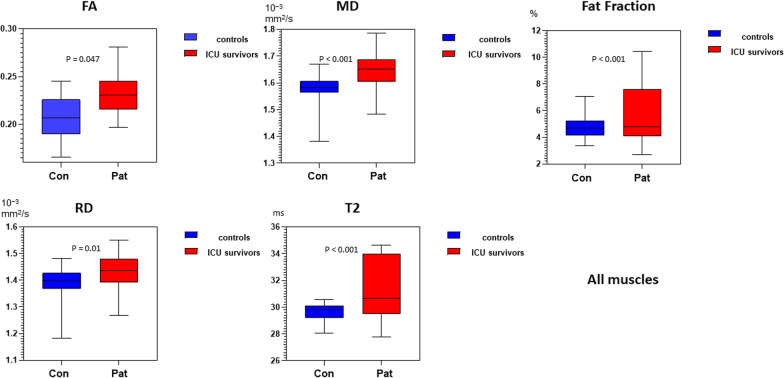 Methods: Using qMRI, the aim of this study was to analyse persisting myostructural abnormalities in former ICU patients compared to controls and relate them to clinical assessments. The study was conducted as a cohort/case-control study. Nine former ICU-patients and matched controls were recruited (7 males; 54.8y ± 16.9; controls: 54.3y ± 11.1). MRI scans were performed on a 3T-MRI including a mDTI, T2 mapping and a mDixonquant sequence. Water T2 times, fat-fraction and mean values of the eigenvalue (λ1), mean diffusivity (MD), radial diffusivity (RD) and fractional anisotropy (FA) were obtained for six thigh and seven calf muscles bilaterally. Clinical assessment included strength testing, electrophysiologic studies and a questionnaire on quality-of-life (QoL). Study groups were compared using a multivariate general linear model. qMRI parameters were correlated to clinical assessments and QoL questionnaire using Pearson´s correlation.