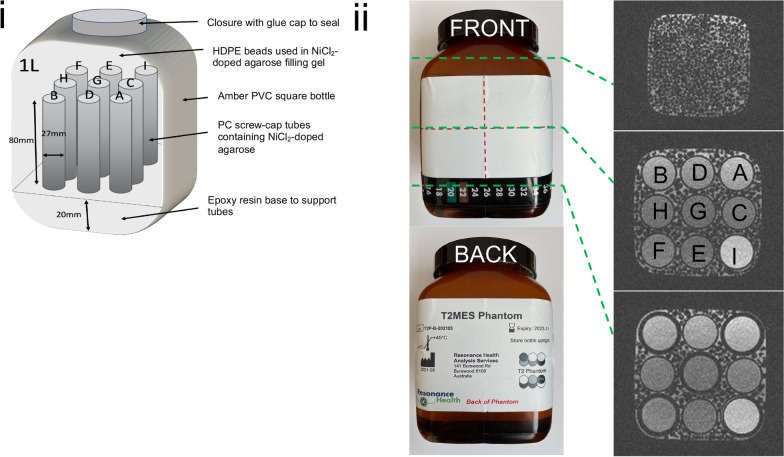 Results: The phantom embodies 9 internal agarose-containing T1|T2 tubes doped with nickel di-chloride (NiCl2) as the paramagnetic relaxation modifier to cover the clinically relevant spectrum of myocardial T2. The tubes are surrounded by an agarose-gel matrix which is doped with NiCl2 and packed with high-density polyethylene (HDPE) beads. All tubes at both field strengths, showed measurement errors up to ≤ 7.2 ms [< 14.7%] for estimated T2 by balanced steady-state free precession T2 mapping compared to reference SE T2 with the exception of the post-contrast tube of ultra-low T1 where the deviance was up to 16 ms [40.0%]. At 12 months, the phantom remained free of air bubbles, susceptibility, and off-resonance artifacts. The inclusion of HDPE beads effectively flattened the B0 and B1 magnetic fields in the imaged slice. Independent temperature dependency experiments over the 13-38 °C range confirmed the greater stability of shorter vs longer T1|T2 tubes. Excellent long-term (12-month) reproducibility of measured T1|T2 was demonstrated across both field strengths (all coefficients of variation < 1.38%).