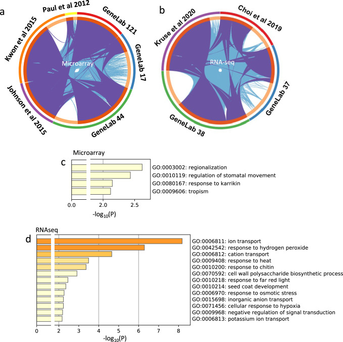 Spaceflight presents a multifaceted environment for plants, combining the effects on growth of many stressors and factors including altered gravity, the influence of experiment hardware, and increased radiation exposure. To help understand the plant response to this complex suite of factors this study compared transcriptomic analysis of 15 Arabidopsis thaliana spaceflight experiments deposited in the National Aeronautics and Space Administration's GeneLab data repository. These data were reanalyzed for genes showing significant differential expression in spaceflight versus ground controls using a single common computational pipeline for either the microarray or the RNA-seq datasets. Such a standardized approach to analysis should greatly increase the robustness of comparisons made between datasets. This analysis was coupled with extensive cross-referencing to a curated matrix of metadata associated with these experiments. Our study reveals that factors such as analysis type (i.e., microarray versus RNA-seq) or environmental and hardware conditions have important confounding effects on comparisons seeking to define plant reactions to spaceflight. The metadata matrix allows selection of studies with high similarity scores, i.e., that share multiple elements of experimental design, such as plant age or flight hardware. Comparisons between these studies then helps reduce the complexity in drawing conclusions arising from comparisons made between experiments with very different designs.