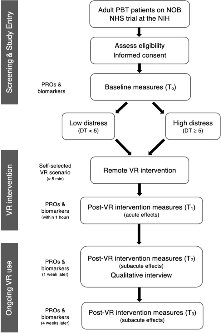 Methods: PBT patients (N = 120) with upcoming MRI scans and clinical appointments who meet eligibility will be recruited to participate in a single arm trial conducted remotely through the NIH. Following completion of baseline assessments, participants will complete a 5-min VR intervention via telehealth using a head-mounted immersive device while under supervision of the research team. Following the intervention, over the course of 1 month patients can use VR at their discretion with follow-up assessments done immediately post-VR intervention, as well as 1 week and 4 weeks later. Additionally, a qualitative phone interview will be conducted to assess patient satisfaction with the intervention.