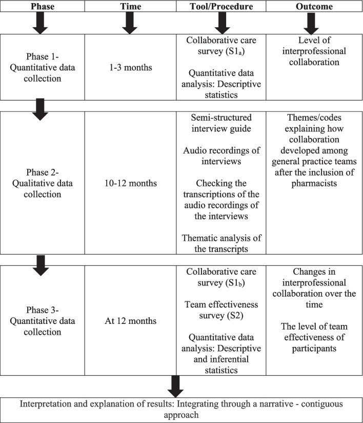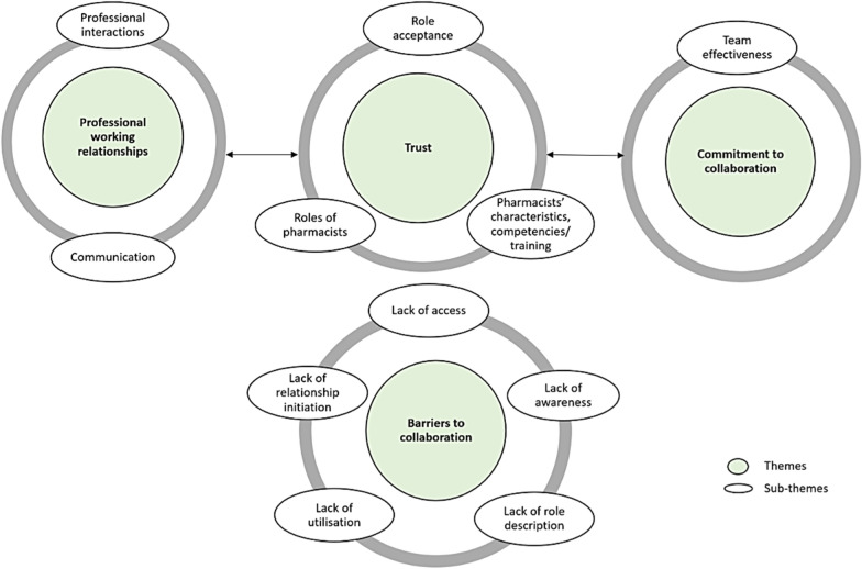 Results: In total, 56 and 41 participants completed the baseline and follow-up survey, including 26 who completed both surveys to assess the change in collaboration over time. Interprofessional collaboration scores were high initially and did not change over time. Team effectiveness was also high at the end of the study. Twenty-one individuals participated in interviews, which generated four main interrelated themes related to interprofessional collaboration: professional working relationships, trust, commitment to collaboration, and barriers to collaboration. Trust was integral to professional working relationships and commitment to collaboration. The barriers to collaboration included not having a role description for pharmacists, inadequate interest to initiate working relationships, lack of dedicated time for interaction, lack of utilisation, and poor awareness of pharmacist-led activities in general practice.