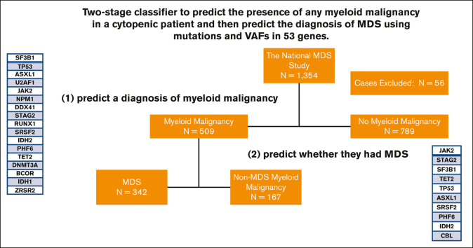 The National Heart, Lung, and Blood Institute-funded National MDS Natural History Study (NCT02775383) is a prospective cohort study enrolling patients with cytopenia with suspected myelodysplastic syndromes (MDS) to evaluate factors associated with disease. Here, we sequenced 53 genes in bone marrow samples harvested from 1298 patients diagnosed with myeloid malignancy, including MDS and non-MDS myeloid malignancy or alternative marrow conditions with cytopenia based on concordance between independent histopathologic reviews (local, centralized, and tertiary to adjudicate disagreements when needed). We developed a novel 2-stage diagnostic classifier based on mutational profiles in 18 of 53 sequenced genes that were sufficient to best predict a diagnosis of myeloid malignancy and among those with a predicted myeloid malignancy, predict whether they had MDS. The classifier achieved a positive predictive value (PPV) of 0.84 and negative predictive value (NPV) of 0.8 with an area under the receiver operating characteristic curve (AUROC) of 0.85 when classifying patients as having myeloid vs no myeloid malignancy based on variant allele frequencies (VAFs) in 17 genes and a PPV of 0.71 and NPV of 0.64 with an AUROC of 0.73 when classifying patients as having MDS vs non-MDS malignancy based on VAFs in 10 genes. We next assessed how this approach could complement histopathology to improve diagnostic accuracy. For 99 of 139 (71%) patients (PPV of 0.83 and NPV of 0.65) with local and centralized histopathologic disagreement in myeloid vs no myeloid malignancy, the classifier-predicted diagnosis agreed with the tertiary pathology review (considered the internal gold standard).