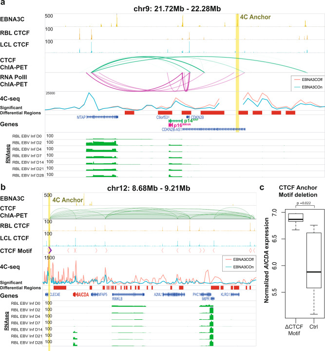 Epstein-Barr virus (EBV) immortalization of resting B lymphocytes (RBLs) to lymphoblastoid cell lines (LCLs) models human DNA tumor virus oncogenesis. RBL and LCL chromatin interaction maps are compared to identify the spatial and temporal genome architectural changes during EBV B cell transformation. EBV induces global genome reorganization where contact domains frequently merge or subdivide during transformation. Repressed B compartments in RBLs frequently switch to active A compartments in LCLs. LCLs gain 40% new contact domain boundaries. Newly gained LCL boundaries have strong CTCF binding at their borders while in RBLs, the same sites have much less CTCF binding. Some LCL CTCF sites also have EBV nuclear antigen (EBNA) leader protein EBNALP binding. LCLs have more local interactions than RBLs at LCL dependency factors and super-enhancer targets. RNA Pol II HiChIP and FISH of RBL and LCL further validate the Hi-C results. EBNA3A inactivation globally alters LCL genome interactions. EBNA3A inactivation reduces CTCF and RAD21 DNA binding. EBNA3C inactivation rewires the looping at the CDKN2A/B and AICDA loci. Disruption of a CTCF site at AICDA locus increases AICDA expression. These data suggest that EBV controls lymphocyte growth by globally reorganizing host genome architecture to facilitate the expression of key oncogenes.