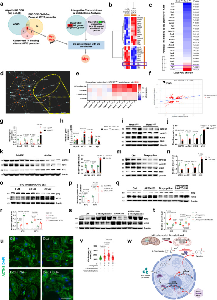 The regulation of the informational flow from the mitochondria to the nucleus (mitonuclear communication) is not fully characterized in the heart. We have determined that mitochondrial ribosomal protein S5 (MRPS5/uS5m) can regulate cardiac function and key pathways to coordinate this process during cardiac stress. We demonstrate that loss of Mrps5 in the developing heart leads to cardiac defects and embryonic lethality while postnatal loss induces cardiac hypertrophy and heart failure. The structure and function of mitochondria is disrupted in Mrps5 mutant cardiomyocytes, impairing mitochondrial protein translation and OXPHOS. We identify Klf15 as a Mrps5 downstream target and demonstrate that exogenous Klf15 is able to rescue the overt defects and re-balance the cardiac metabolome. We further show that Mrps5 represses Klf15 expression through c-myc, together with the metabolite L-phenylalanine. This critical role for Mrps5 in cardiac metabolism and mitonuclear communication highlights its potential as a target for heart failure therapies.
