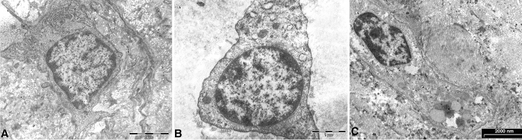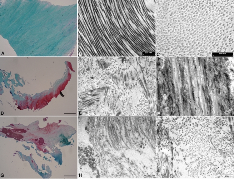 Over the last decade, evidence has mounted for a prominent etiologic role of femoroacetabular impingement (FAI) in the development of early hip osteoarthritis (OA). The aim of this study was to compare the ultrastructure and tissue composition of the hip labrum in healthy and pathological conditions, as FAI and OA, to provide understanding of structural changes which might be helpful in the future to design targeted therapies and improve treatment indications. We analyzed labral tissue samples from five healthy multi-organ donors (MCDs) (median age, 38 years), five FAI patients (median age, 37 years) and five late-stage OA patients undergoing total hip replacement (median age, 56 years). We evaluated morpho-functional by histology and transmission electron microscopy. Extracellular matrix (ECM) structure changes were similar in specimens from FAI compared to those from patients with OA (more severe in the latter) showing disorganization of collagen fibers and increased proteoglycan content. In FAI and in OA nuclei the chromatin was condensed, organelle degenerated and cytoplasm vacuolized. Areas of calcification were mainly observed in FAI and OA labrum, as well as apoptotic-like features. We showed that labral tissue of patients with FAI had similar pathological alterations of tissue obtained from OA patients, suggesting that FAI patients might have high susceptibility to develop OA.