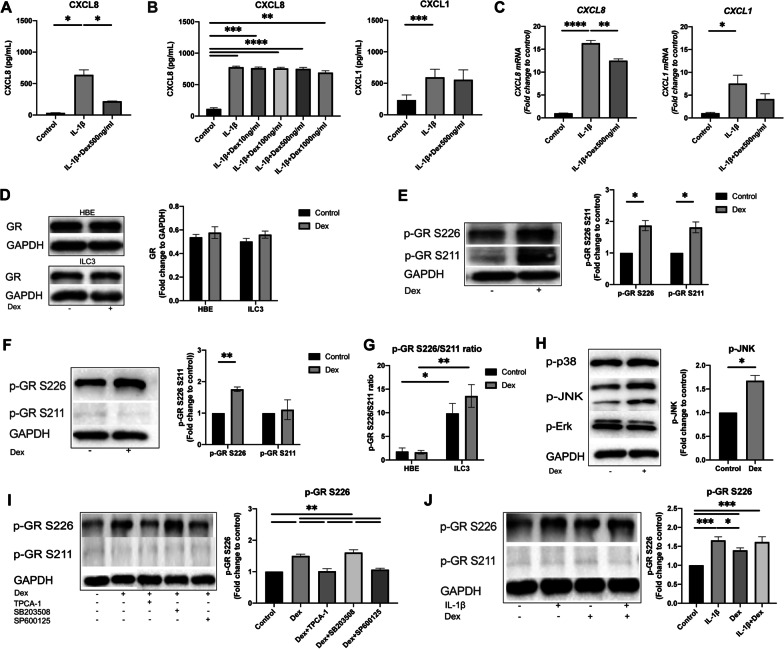 Results: The percentage and numbers of ILC3s in peripheral blood was higher in patients with NEA compared with EA, and negatively correlated with blood eosinophils. IL-1β stimulation significantly enhanced CXCL8 and CXCL1 production in ILC3s via activation of p65 NF-κB and p38/JNK MAPK signaling pathways. The expression of neutrophil chemoattractants from ILC3s was insensitive to dexamethasone treatment. Dexamethasone significantly increased phosphorylation of glucocorticoid receptor (GR) at Ser226 but only with a weak induction at Ser211 residues in ILC3s. Compared to human bronchial epithelial cell line (16HBE cells), the ratio of p-GR S226 to p-GR S211 (p-GR S226/S211) was significantly higher in ILC3s at baseline and after dexamethasone treatment. In addition, IL-1β could induce Ser226 phosphorylation and had a crosstalk effect to dexamethasone via NF-κB pathway.