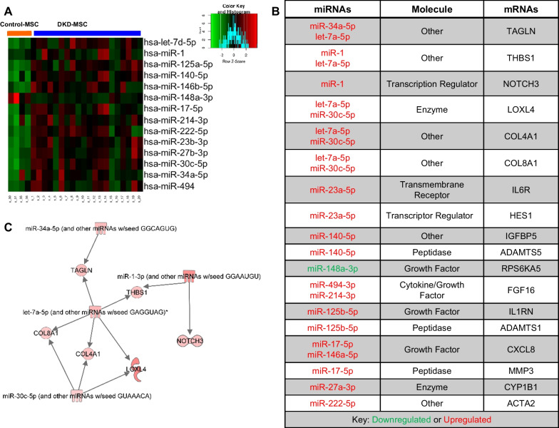 Methods: To explore the angiogenic activity of MSC in DKD, the transcriptome of adipose tissue-derived MSC obtained from DKD subjects was compared to age-matched controls without diabetes or kidney impairment. Next-generation RNA sequencing (RNA-seq) was performed on MSC (DKD n = 29; Controls n = 9) to identify differentially expressed (DE; adjusted p < 0.05, |log2fold change|> 1) messenger RNA (mRNA) and microRNA (miRNA) involved in angiogenesis (GeneCards). Paracrine-mediated angiogenic repair capacity of MSC conditioned medium (MSCcm) was assessed in vitro using human umbilical vein endothelial cells incubated in high glucose and indoxyl sulfate for a hyperglycemic, uremic state.