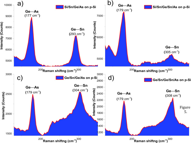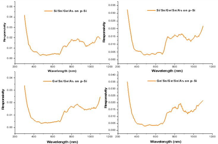 GeSn compounds have made many interesting contributions in photodetectors (PDs) over the last ten years, as they have a detection limit in the NIR and mid-IR region. Sn incorporation in Ge alters the cut off wavelength. In the present article, p-i-n structures based on GeSn junctions were fabricated to serve as PDs. Arsine (As) is incorporated to develop n-GeSn compounds via a metal induced crystallization (MIC) process followed by i-GeSn on p-Si wafers. The impact of As and Sn doping on the strain characteristics of GeSn has been studied with high resolution transmission electron microscopy (HRTEM), X-ray diffraction and Raman spectroscopy analyses. The direct transitions and tuning of their band energies have been investigated using diffuse reflectance UV-vis spectroscopy and photoluminescence (PL). The barrier height and spectral responsivity have been controlled with incorporation of As. Variation of As incorporation into GeSn Compounds shifted the Raman peak and hence affected the strain in the Ge network. UV-vis spectroscopy showed that the direct transition energies are lowered as the Ge-As bonding increases as illustrated in Raman spectroscopy investigations. PL and UV-vis spectroscopy of annealed heterostructures at 500 °C showed that there are many transition peaks from the UV to the NIR region as result of oxygen vacancies in the Ge network. The calculated diode parameters showed that As incorporation leads to an increase of the height barrier and thus dark current. Spectral response measurements show that the prepared heterojunctions have spectral responses in near UV and NIR regions that gives them opportunities in UV and NIR photodetection-applications.