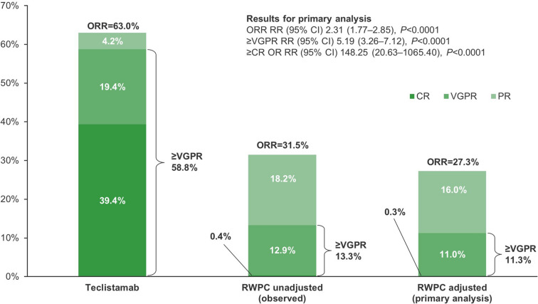 Results: After weighting, baseline characteristics were balanced across cohorts. In adjusted comparisons, teclistamab-treated patients were 2.3-fold, 5.2-fold and 148.3-fold, more likely to reach ORR [response-rate ratio (RR) = 2.31, 95% CI 1.77-2.85, p < 0.0001], ≥ VGPR (RR = 5.19, 95% CI 3.26-7.12, p < 0.0001) and ≥ CR (RR = 148.25, 95% CI 20.63-1065.40, p < 0.0001), respectively, versus patients receiving RWPC. Following adjustment, DOR (HR 0.32, 95% CI 0.19-0.54, p < 0.0001) and PFS (HR 0.48, 95% CI 0.35-0.65, p < 0.0001) were significantly longer with teclistamab versus RWPC. OS was numerically better with teclistamab versus RWPC [HR 0.77 (0.55-1.09), p = 0.1419].
