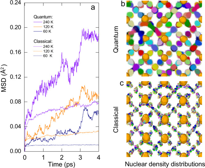 The discovery of 250-kelvin superconducting lanthanum polyhydride under high pressure marked a significant advance toward the realization of a room-temperature superconductor. X-ray diffraction (XRD) studies reveal a nonstoichiometric LaH9.6 or LaH10±δ polyhydride responsible for the superconductivity, which in the literature is commonly treated as LaH10 without accounting for stoichiometric defects. Here, we discover significant nuclear quantum effects (NQE) in this polyhydride, and demonstrate that a minor amount of stoichiometric defects will cause quantum proton diffusion in the otherwise rigid lanthanum lattice in the ground state. The diffusion coefficient reaches ~10-7 cm2/s in LaH9.63 at 150 gigapascals and 240 kelvin, approaching the upper bound value of interstitial hydrides at comparable temperatures. A puzzling phenomenon observed in previous experiments, the positive pressure dependence of the superconducting critical temperature Tc below 150 gigapascals, is explained by a modulation of the electronic structure due to a premature distortion of the hydrogen lattice in this quantum fluxional structure upon decompression, and resulting changes of the electron-phonon coupling. This finding suggests the coexistence of the quantum proton fluxion and hydrogen-induced superconductivity in this lanthanum polyhydride, and leads to an understanding of the structural nature and superconductivity of nonstoichiomectric hydrogen-rich materials.