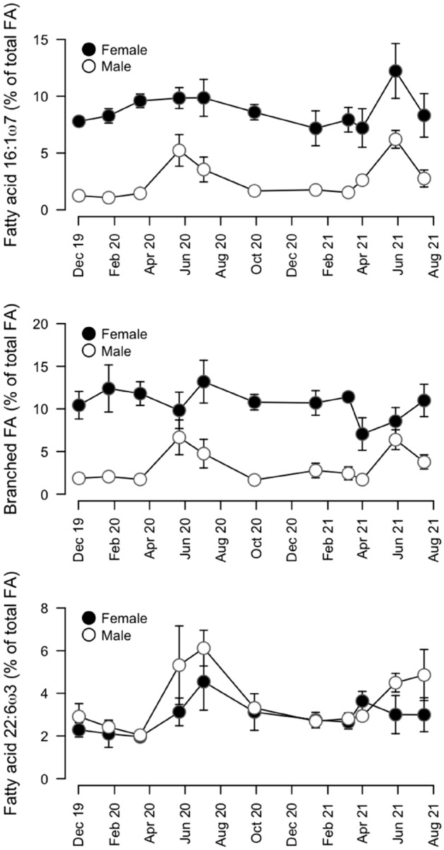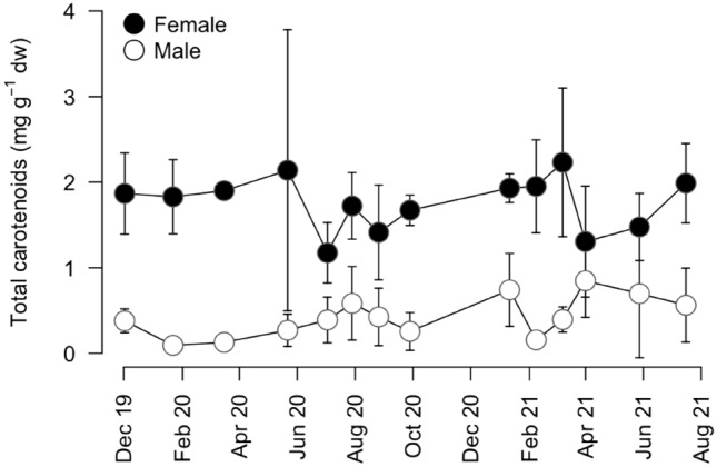 ) Holothuria forskali sampled in the Glénan Islands, France, from December 2019 to July 2021. n = 2–6 females and 1–6 males for each sampling event. Error bars: ± SD